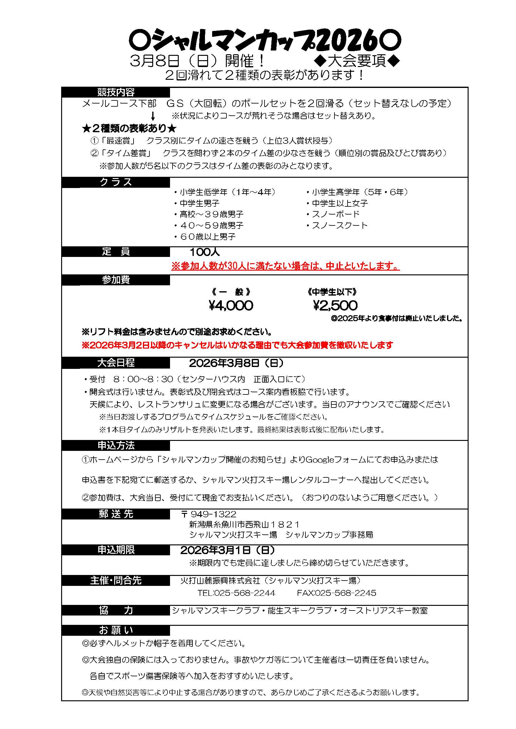 毎年恒例のスキー大会「シャルマンカップ」を開催いたします。